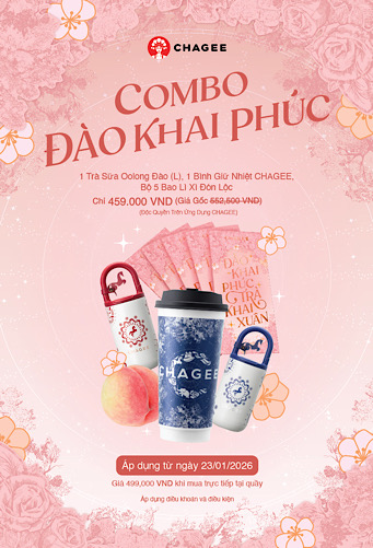 Trong khuôn khổ chương trình “Đào Khai Phúc – Trà Khai Xuân”, CHAGEE mang đến cơ hội trải nghiệm dùng thử sản phẩm với mức giá ưu đãi đặc biệt chỉ 39.000 VNĐ cho một ly Trà sữa Oolong Đào (size L) khi đặt qua ứng dụng và 49.000 VNĐ khi mua trực tiếp tại cửa hàng, áp dụng từ ngày 16/01 – 18/01/2026. Đi kèm với dòng sản phẩm mới, thương hiệu cũng cho ra mắt bộ sưu tập quà lưu niệm phiên bản giới hạn bao gồm túi tote, ví đựng thẻ, thẻ gắn hành lý mang đậm dấu ấn Trà Ô Long Đào và các ly Tết thiết kế riêng.