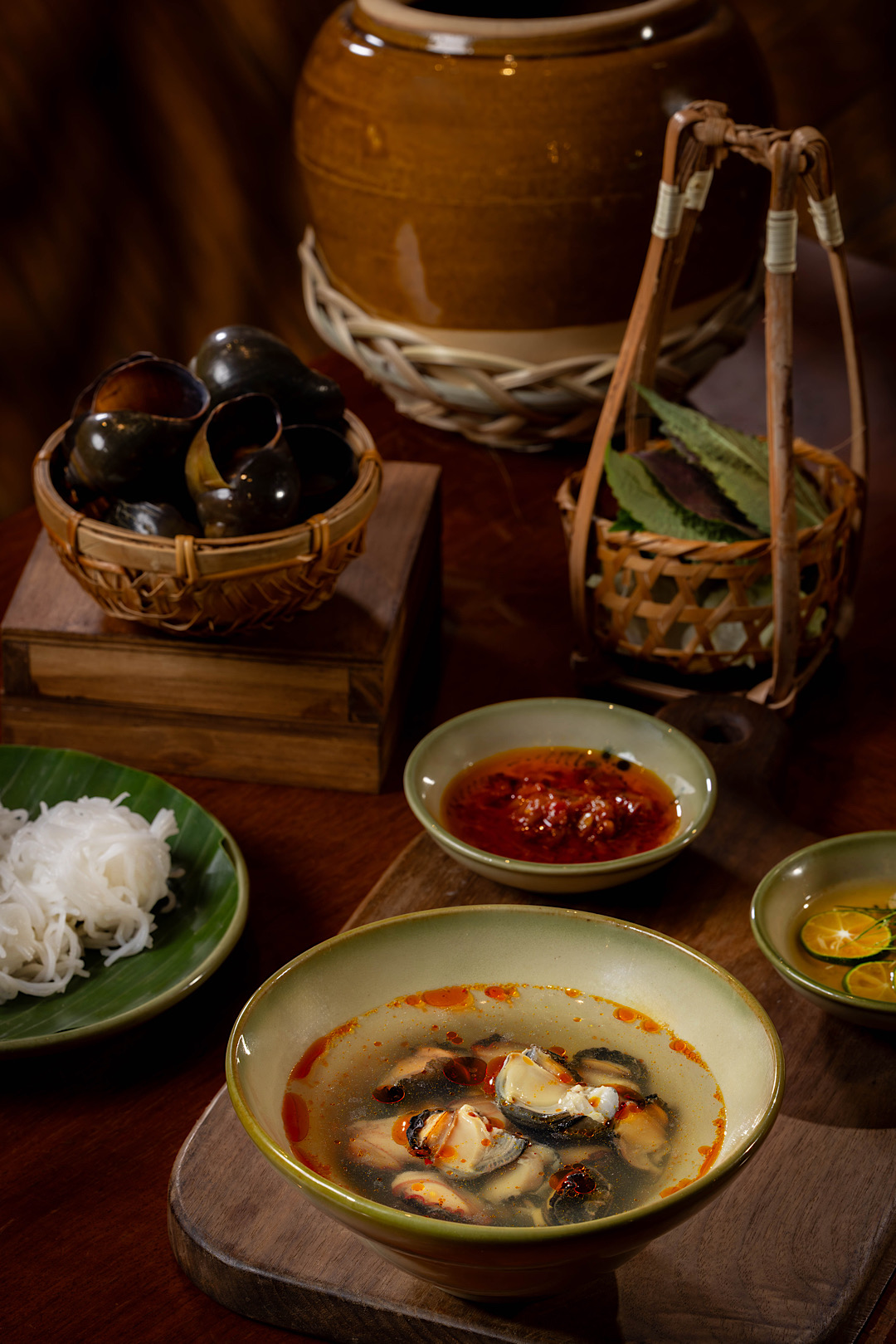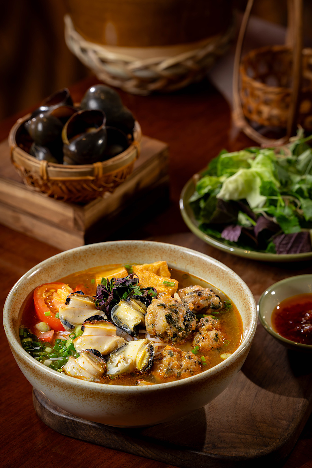 Khép lại chuyến đi là bún ốc nóng, món quen từng xuất hiện trong buffet của Việt Kitchen và được thực khách yêu mến suốt mùa hè năm ngoái. Trở lại lần này, bún ốc vẫn giữ nguyên vị giòn ngọt của ốc, nước dùng chua thanh, thêm chút rau xanh và ớt chưng nhà làm. Mộc mạc mà đậm đà, đủ để lại lưu dấu trong lòng người thưởng thức.