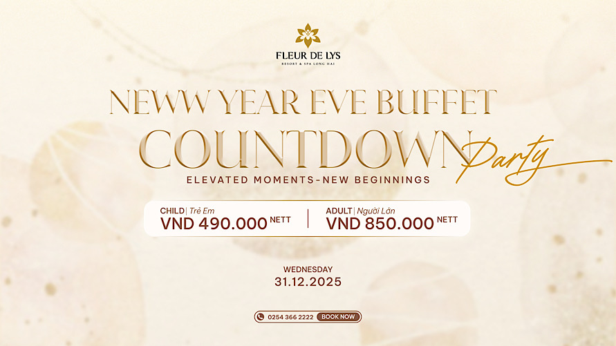 Trong thời khắc giao thoa của đất trời, Fleur de Lys Resort & Spa Long Hai trân trọng giới thiệu chương trình New Year’s Eve Buffet & Countdown Party 2026. Diễn ra vào tối 31/12/2025, sự kiện là sự kết hợp hoàn hảo giữa ẩm thực tinh tế, âm nhạc acoustic và không gian biển đêm khoáng đạt.