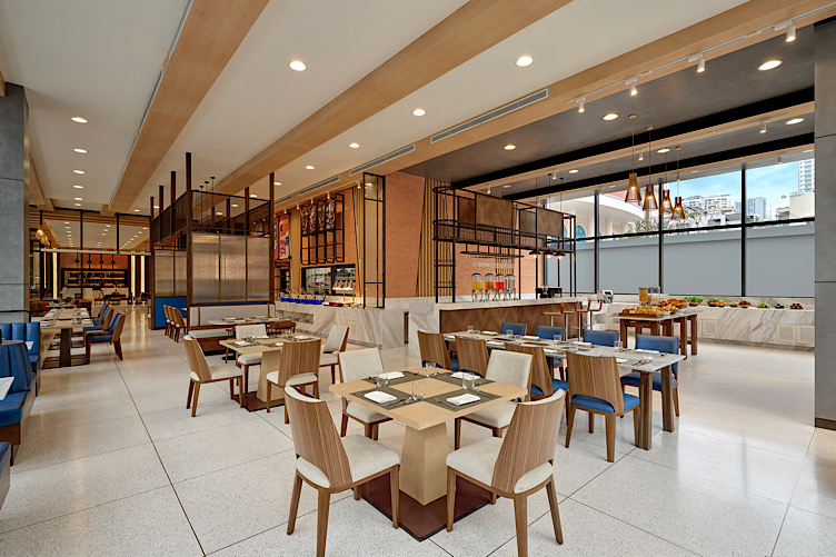 Không gian ẩm thực tại Four Points by Sheraton Nha Trang hướng đến tinh thần thoải mái và năng động, phù hợp với phong cách của đa dạng thực khách. The Mesh là nhà hàng phục vụ cả ngày với không gian mở vô cùng hiện đại, kết hợp hài hòa với những chi tiết thiết kế mang đến cảm giác gần gũi và quen thuộc. Tại đây, thực khách có thể thưởng thức ẩm thực Việt Nam và quốc tế, đặc biệt là các món đặc sản địa phương như cá chim nướng lá chuối, nem nướng Nha Trang, hay bún cá thu chả mực. Ngoài việc phục vụ ẩm thực cả ngày, The Mesh còn mang đến một không gian thư giãn, nơi thực khách có thể gặp gỡ bạn bè, người thân hoặc đồng nghiệp, đồng thời nhâm nhi các dòng bia thủ công như bia Lager dùng cùng cua lột chiên giòn sốt me, hay bia đen kết hợp với hải sản nướng.