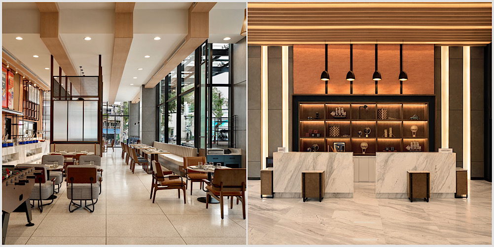 Từ trái qua phải: Nhà hàng The Mesh và Khu vực lễ tân của khách sạn