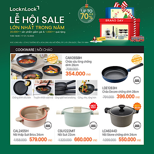 | LocknLock Brand Day 2025 – Địa chỉ: Cửa hàng W2C Long Hậu, Lô N-5,7, đường số 6, KCN Long Hậu mở rộng, Ấp 3, Cần Giuộc, Tây Ninh – Thời gian chương trình: 9h00 – 18h00 từ ngày 17/12 – 21/12/2025 – Truy cập Website https://locknlock.vn/ để không bỏ lỡ những ưu đãi hấp dẫn nhất này! – Hotline: 028 3713 5750 (HCM) |