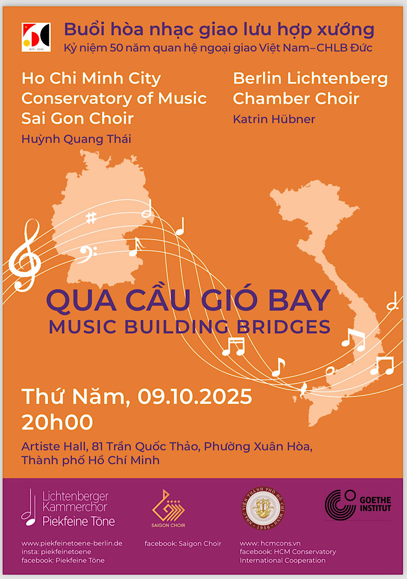 Ngày 9/10/2025, nhân dịp kỷ niệm 50 năm thiết lập quan hệ ngoại giao Việt Nam – Cộng hòa Liên bang Đức (1975–2025), Nhạc viện TP. Hồ Chí Minh phối hợp tổ chức đêm hòa nhạc tôn vinh tình hữu nghị giữa hai quốc gia, đồng thời mở ra một không gian giao lưu âm nhạc đậm chất văn hóa nghệ thuật. Đây không chỉ là dịp mang âm nhạc thính phòng đến với công chúng mà còn là cơ hội để nghệ sĩ hai nước học hỏi và chia sẻ kinh nghiệm cùng nhau, góp phần củng cố quan hệ hợp tác văn hóa, giáo dục và nghệ thuật, đánh dấu cột mốc quan trọng trong chặng đường 50 năm hợp tác và phát triển.
