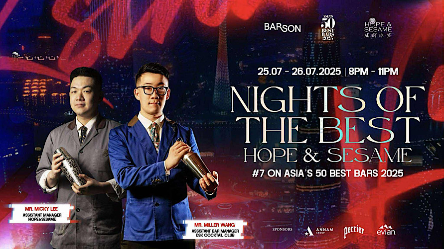 • Hope & Sesame: Sự kết hợp đầu tiên trong chuỗi sự kiện này chính là đối tác khách mời đền từ Hope & Seasame – quán bar đứng thứ 7 trong danh sách 50 quán bar tốt nhất châu Á năm 2025 đến từ Quảng Châu, mang đến bộ sưu tập cocktail độc đáo với nguyên liệu bản sắc địa phương. Những món như Truffle Banana gợi nhớ vị bánh chuối ngọt ngào hay 50/50 Sour, một ly cocktail mang hương vị của trà sữa Hồng Kông, chắc chắn sẽ làm say lòng thực khách.