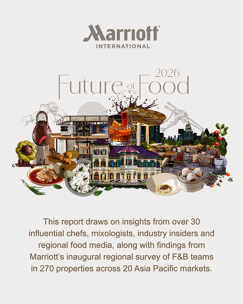 Marriott International vừa công bố báo cáo The Future of Food 2026, một nghiên cứu toàn diện về sự thay đổi trong thói quen và sở thích ẩm thực của thực khách tại khu vực Châu Á – Thái Bình Dương. Báo cáo ghi nhận những xu hướng đang tái định hình bức tranh ẩm thực khu vực, bao gồm sự chuyển dịch từ mô hình ẩm thực cao cấp (fine dining) sang phong cách ẩm thực “cao cấp bình dị (casual luxury), những thực đơn đề cao cảm giác thoải mái, những trải nghiệm ẩm thực đa giác quan và sự tôn vinh sâu sắc đối với nguyên liệu bản địa. Ngày nay, thực khách không chỉ tìm kiếm bữa ăn ngon, mà còn ưu tiên trải nghiệm mang lại cảm xúc và kết nối, nơi nghệ thuật kể chuyện, yếu tố giải trí và thiết kế tinh tế quan trọng không kém hương vị món ăn.