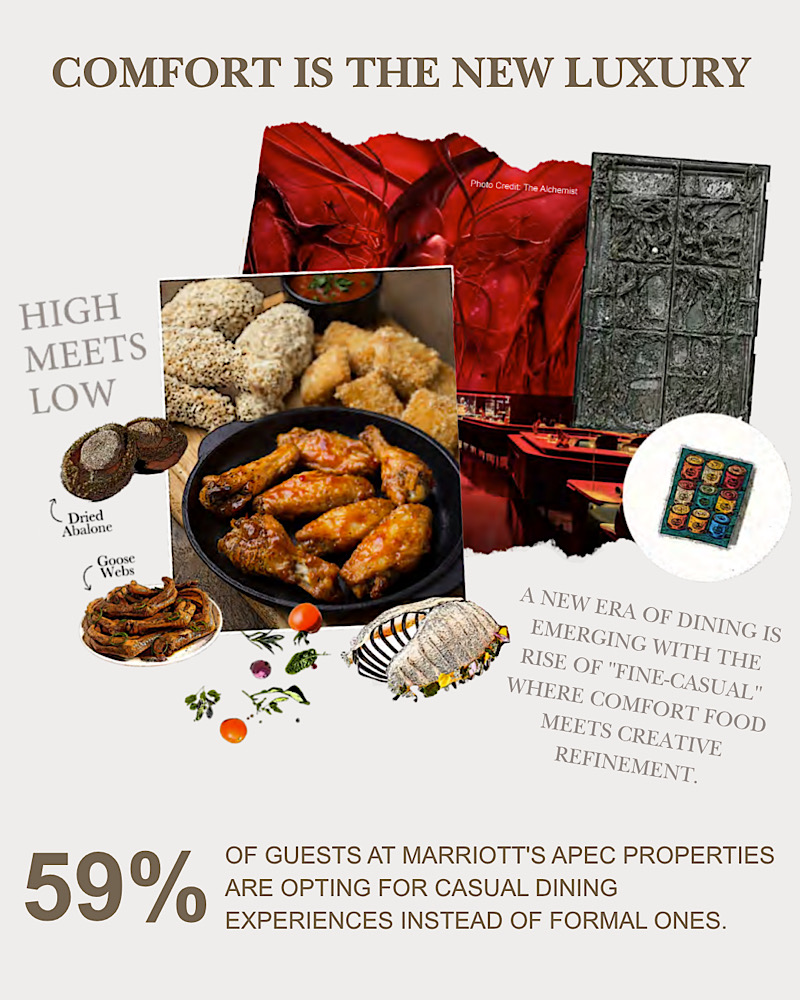 Một kỷ nguyên mới đang mở ra với làn sóng ẩm thực cao cấp bình dị (fine-casual) – nơi những món ăn quen thuộc được nâng tầm bằng sự tinh tế và sáng tạo. Từ món gà rán phủ trứng cá caviar đến thực đơn à la carte linh hoạt mang đậm dấu ấn cá nhân, các đầu bếp từ Singapore đến Tokyo đang mang đến trải nghiệm sang trọng nhưng gần gũi hơn bao giờ hết. Khi thực khách ngày càng khao khát hương vị thân quen pha lẫn chút phá cách, các đầu bếp danh tiếng đang tái sáng tạo những món ăn quen thuộc bằng kỹ thuật tinh tế của fine dining, sự sáng tạo và tính thẩm mỹ trong trình bày. Những thực đơn nhiều món truyền thống đang dần nhường chỗ cho trải nghiệm linh hoạt, nhanh gọn và phù hợp hơn với nhịp sống hiện đại. Theo khảo sát, 59% khách sạn thuộc Marriott International tại khu vực Châu Á – Thái Bình Dương ghi nhận sự gia tăng đáng kể của nhóm khách chọn phong cách ẩm thực thoải mái hơn thay vì hình thức sang trọng trong năm qua.