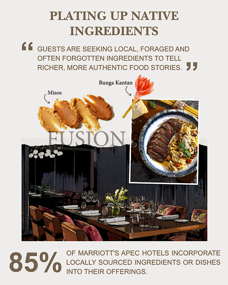 Các đầu bếp đang khai thác nguồn nguyên liệu bản địa như một phần không thể tách rời trong bản sắc ẩm thực cá nhân của mình. Việc ưu tiên sử dụng nguyên liệu địa phương, từ những sản vật được thu hái tự nhiên đến những nguyên liệu từng bị lãng quên, giúp họ kể nên những câu chuyện ẩm thực đậm đà bản sắc và chân thực hơn bao giờ hết. 85% khách sạn Marriott International tại khu vực Châu Á – Thái Bình Dương hiện đã đưa nguyên liệu hoặc món ăn bản địa vào thực đơn, phản ánh xu hướng ngày càng mạnh mẽ hướng đến ẩm thực theo mùa và phát triển bền vững.