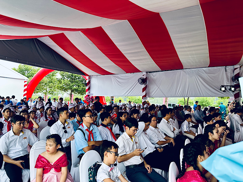 Phần ngoài trời được đầu tư mạnh mẽ với các sân chơi sáng tạo, công viên xanh mát, quảng trường trung tâm tổ chức sự kiện lớn, và các tiểu cảnh gần gũi thiên nhiên. Điểm nhấn là Quảng trường Nước – Khán đài ngoài trời 1.308 chỗ (diện tích sân khấu khoảng 1.246 m²) với mái che linh hoạt, lý tưởng cho các buổi biểu diễn tập thể.