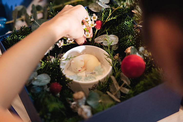 Hộp quà hoa và nến chủ đề Giáng sinh Bắc Cực trong buổi workshop với điểm nhấn là nến thơm hình chú gấu Bắc Cực từ thương hiệu Xinh Botanic Vietnam