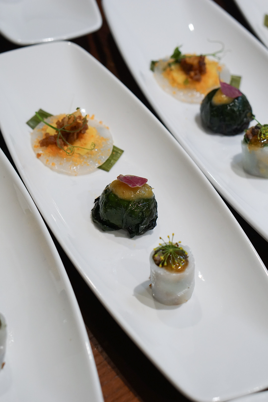 Mở đầu thực đơn là ‘Quà vặt thảo thơm’ với Bánh bèo dùng kèm nước sốt đặc biệt, Chả ốc nướng  từ ốc Bullot cuốn lá lốt, và Bánh cuốn hương cà cuống – một đặc sản của Hà Nội. Những thức quà dân dã tưởng chừng rất quen thuộc ấy lại được biến tấu tinh tế mang đến sự mới mẻ trong cả hương vị và cách bài trí đẹp mắt, thật sự rất lôi cuốn vị giác.