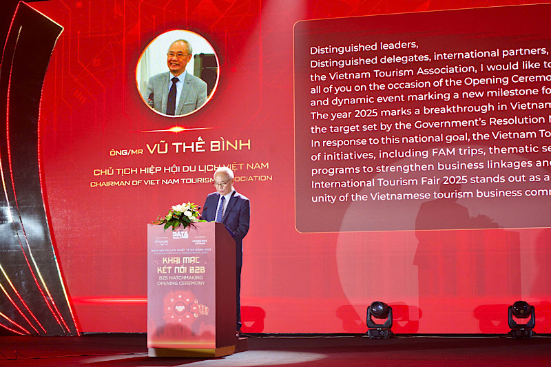 Ông Vũ Thế Bình, Chủ Tịch Hiệp Hội Du Lịch Việt Nam mở màn phát biểu khai mạc tại sự kiện