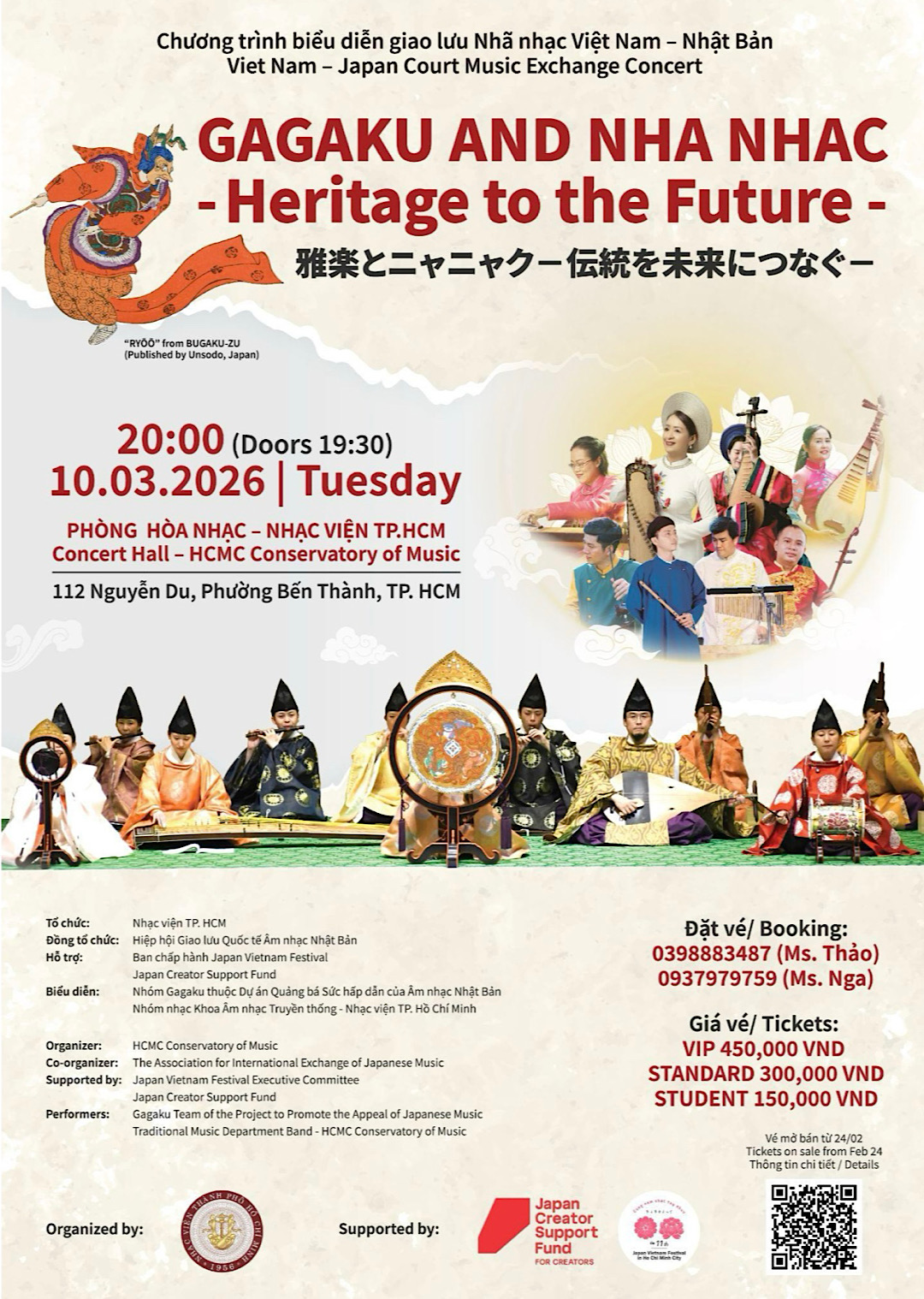 • Buổi hòa nhạc giao lưu Nhã nhạc Việt – Nhật: 20 giờ ngày 10/3/2026 tại Phòng Hòa nhạc, Nhạc viện TP. HCM (112 Nguyễn Du, phường Bến Thành).