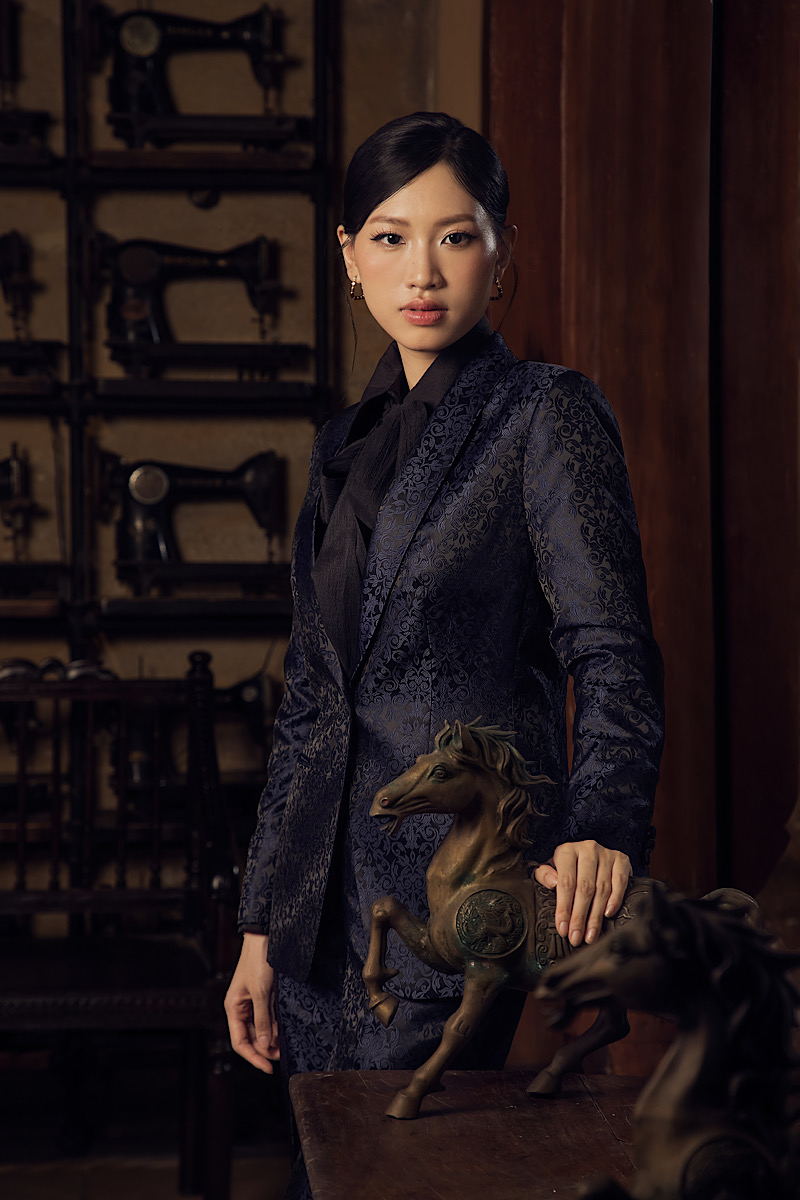 Một lời tri ân tinh tế gửi đến cố đô Huế – nơi sản sinh ra thương hiệu, nơi sự thanh lịch là bản năng và sự tinh tế là tiêu chuẩn. Bộ sưu tập lấy cảm hứng từ hoàng gia xưa, với những thiết kế sử dụng vải gấm và nhung nhập khẩu từ Ý, họa tiết dệt ẩn tinh xảo, đường may tay tỉ mỉ. Những gam màu trầm, đậm chất “regal” như bordeaux, xanh sapphire, đen tuyền – gợi nhắc về sự hiện diện của giới quý tộc: âm trầm, sắc sảo, không thể sao chép.