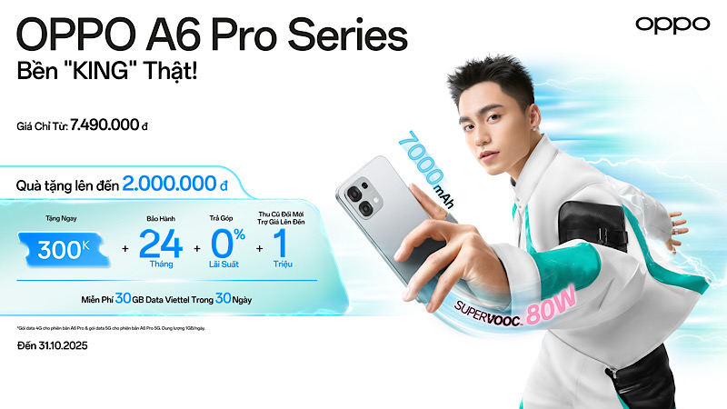 OPPO chính thức giới thiệu OPPO A6 Pro Series tại thị trường Việt Nam. Dòng sản phẩm nổi bật với dung lượng pin siêu lớn lên đến 7.000mAh (cho phiên bản 4G) và 6.500mAh (cho phiên bản 5G), đi kèm công nghệ siêu sạc nhanh SUPERVOOCTM 80W, khả năng kháng nước và bụi đạt chuẩn IP66/IP68/IP69 cùng chứng nhận độ bền chuẩn quân đội, mang lại trải nghiệm liền mạch, bền bỉ suốt cả ngày dài. Bên cạnh đó, OPPO A6 Pro còn sở hữu màn hình siêu sáng AMOLED 120Hz và được tối ưu hiệu năng bởi thuật toán Trinity Engine trên hệ điều hành ColorOS 15 nhằm đảm bảo mọi tác vụ từ làm việc, giải trí đến chơi game đều mượt mà, nhanh chóng.