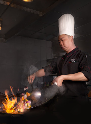 Chef Oai trong quá trình thực hiện các món chiên và xào tại bếp Kabin